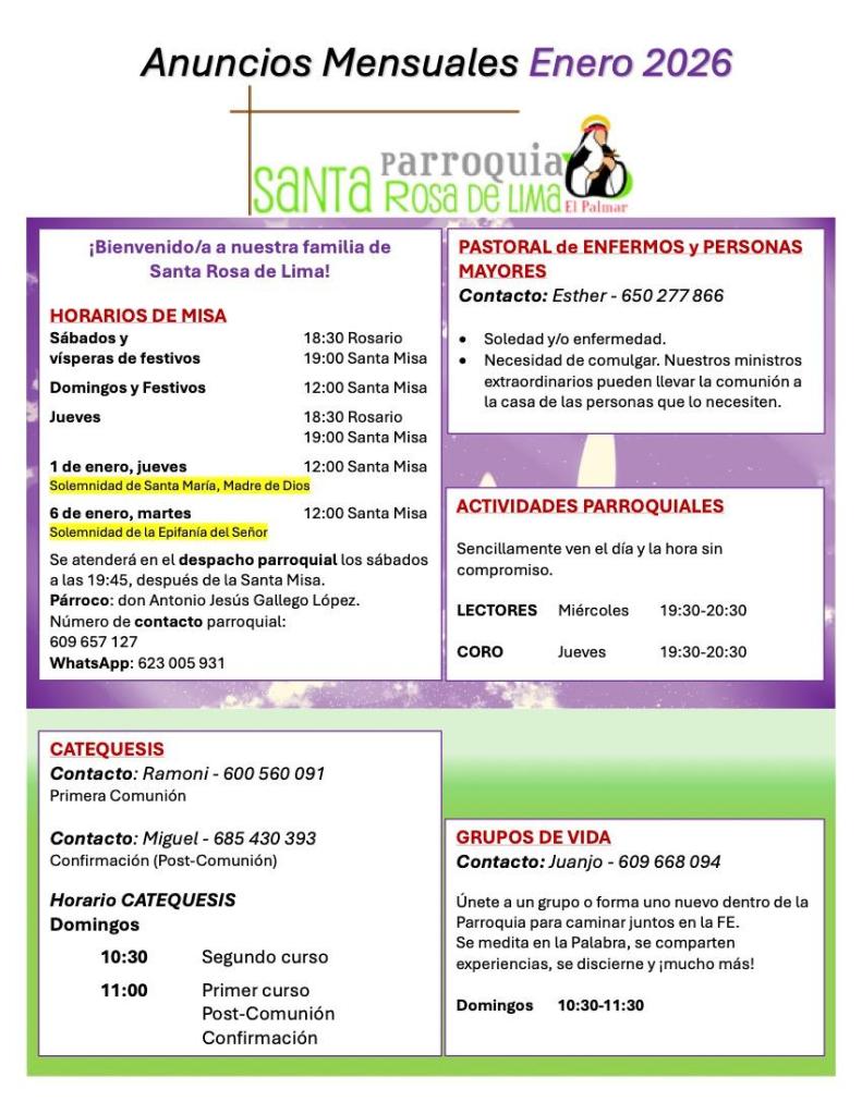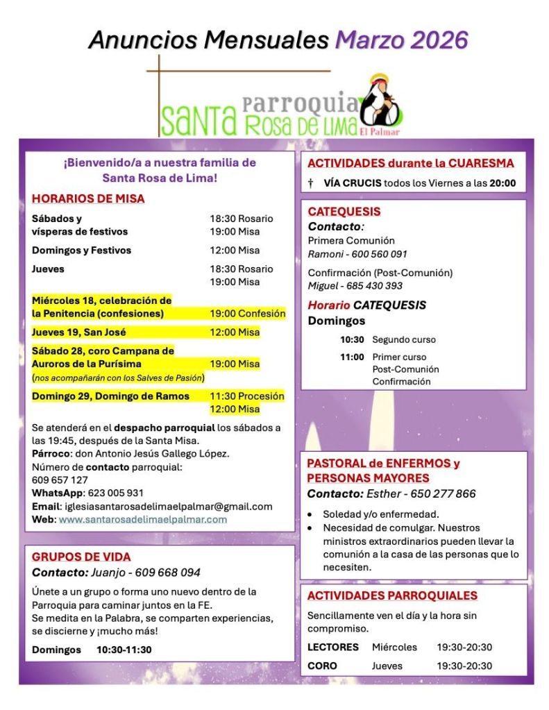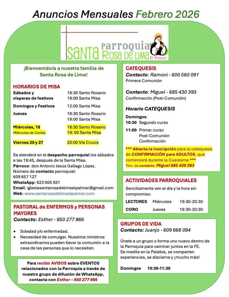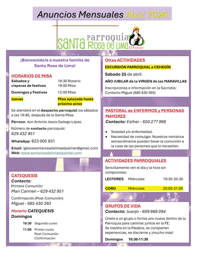 Bienvenido a la página web de la Parroquia de Santa Rosa de Lima de El Palmar (Murcia).